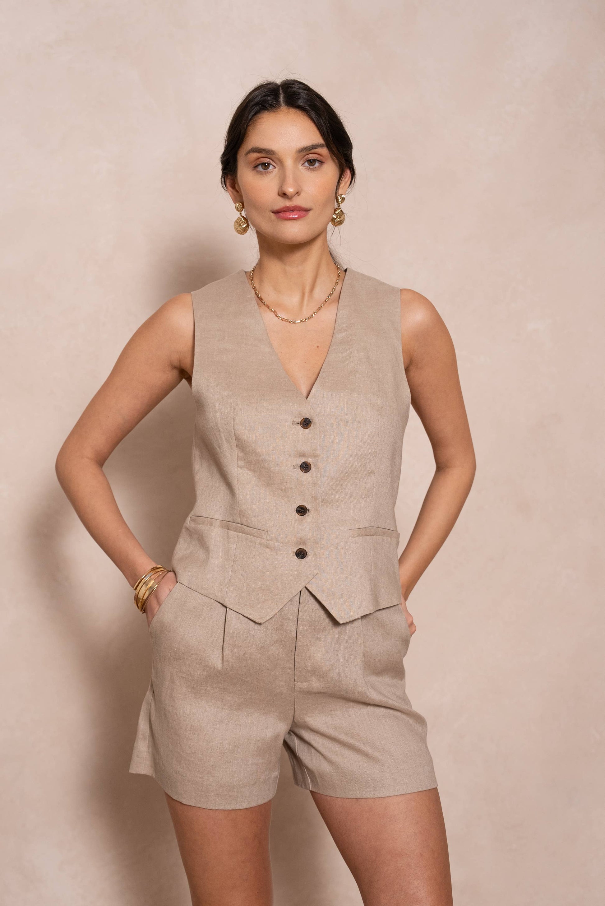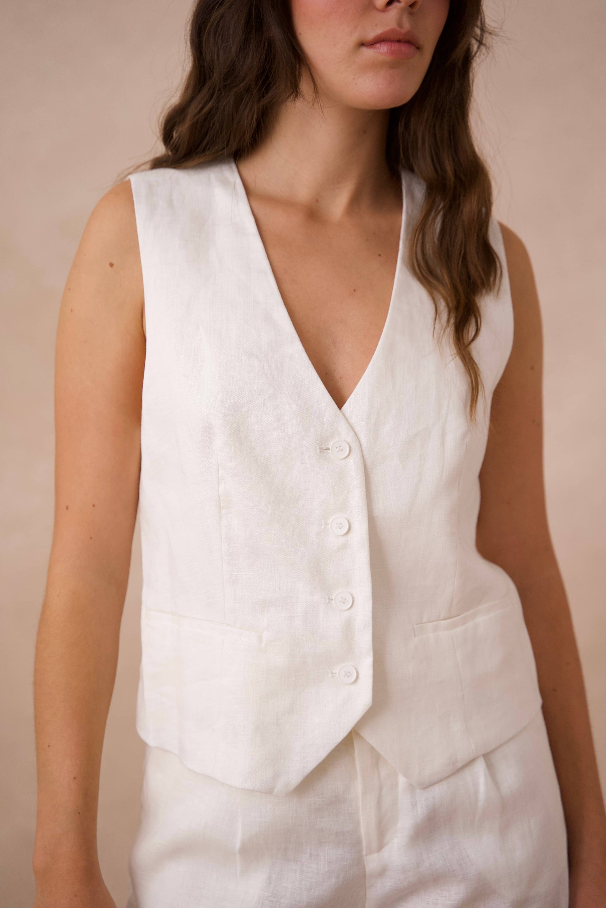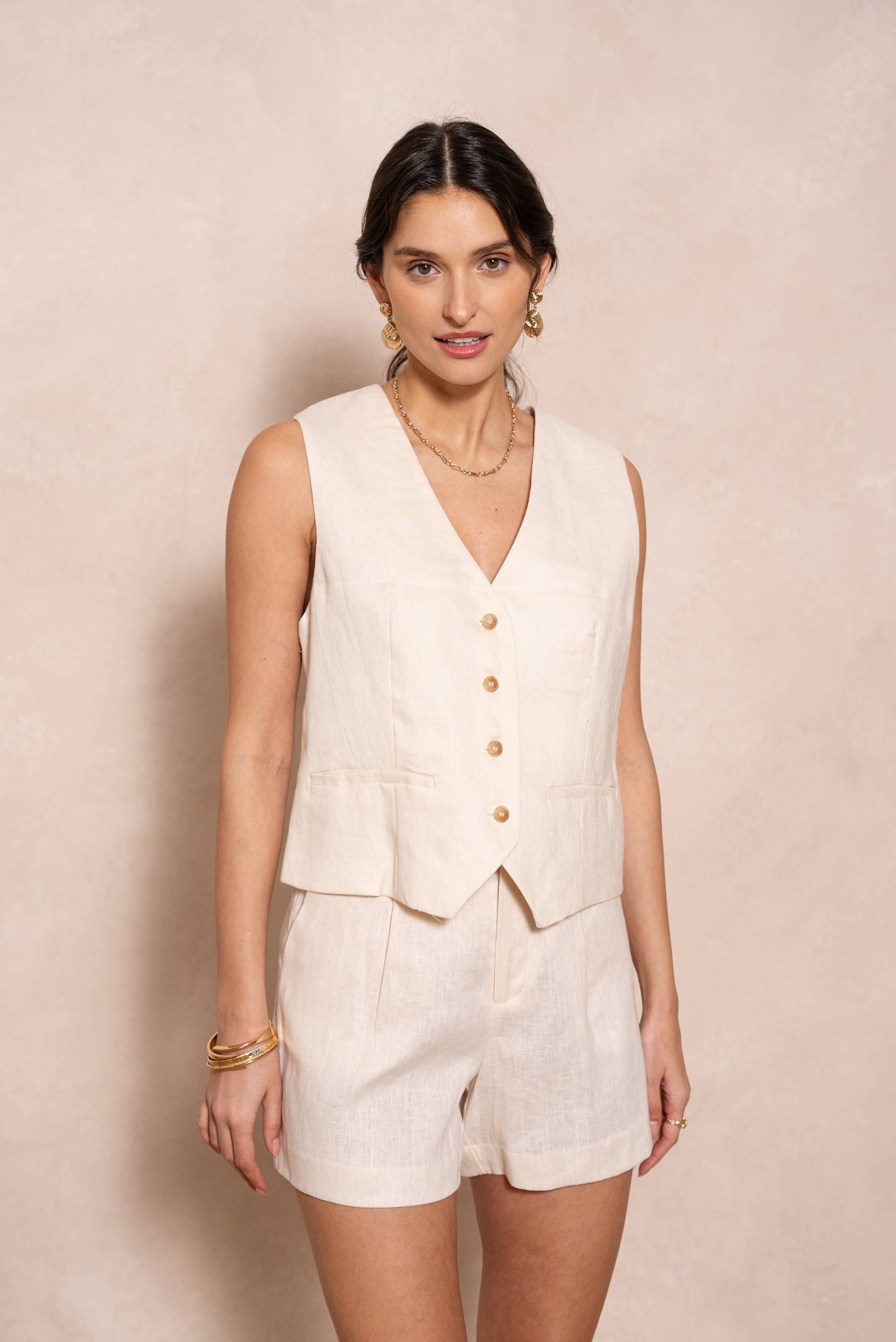 Die Weste Noa aus hochwertigem Leinen überzeugt durch ihre klare Silhouette und ihre vielseitige Kombinierbarkeit.