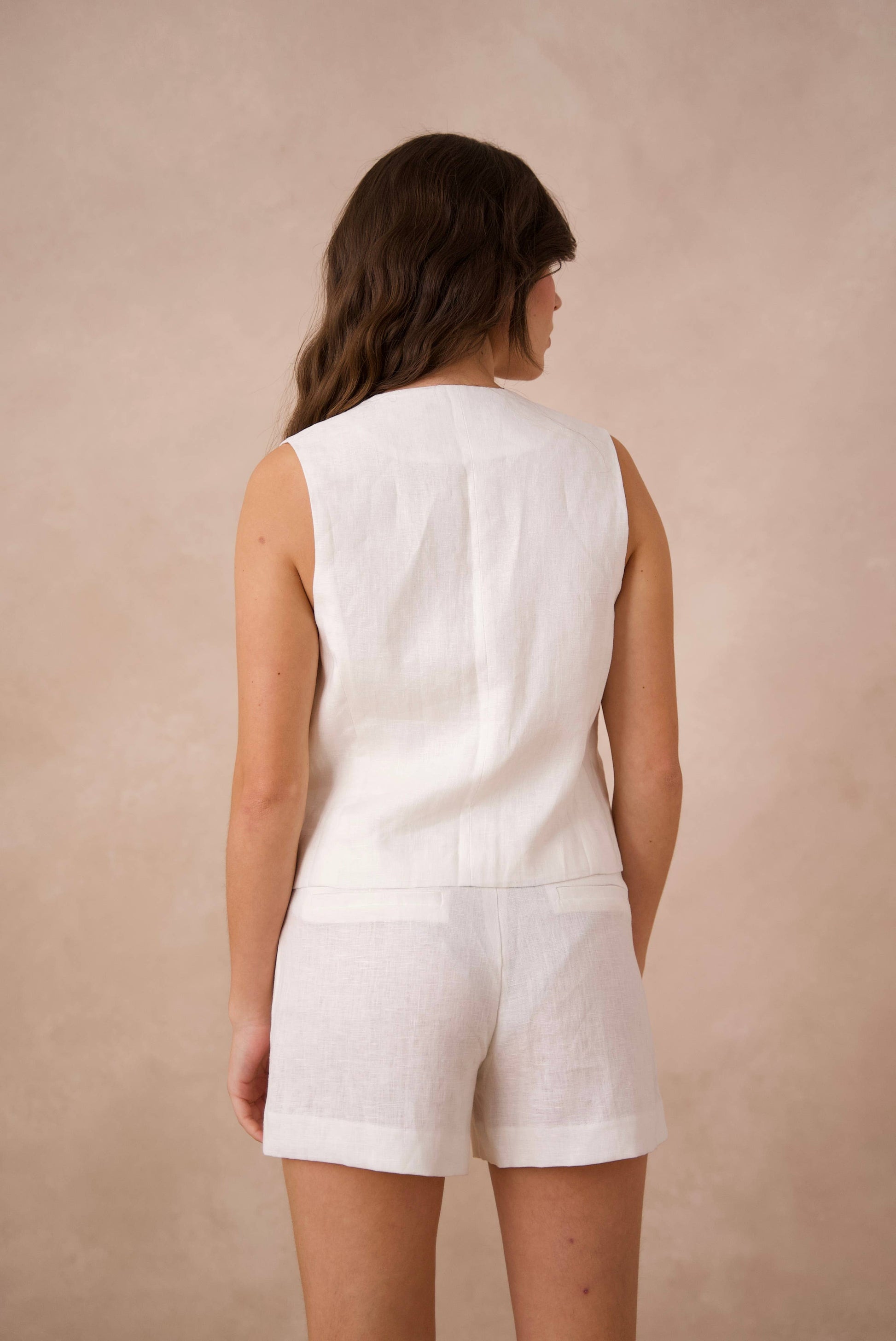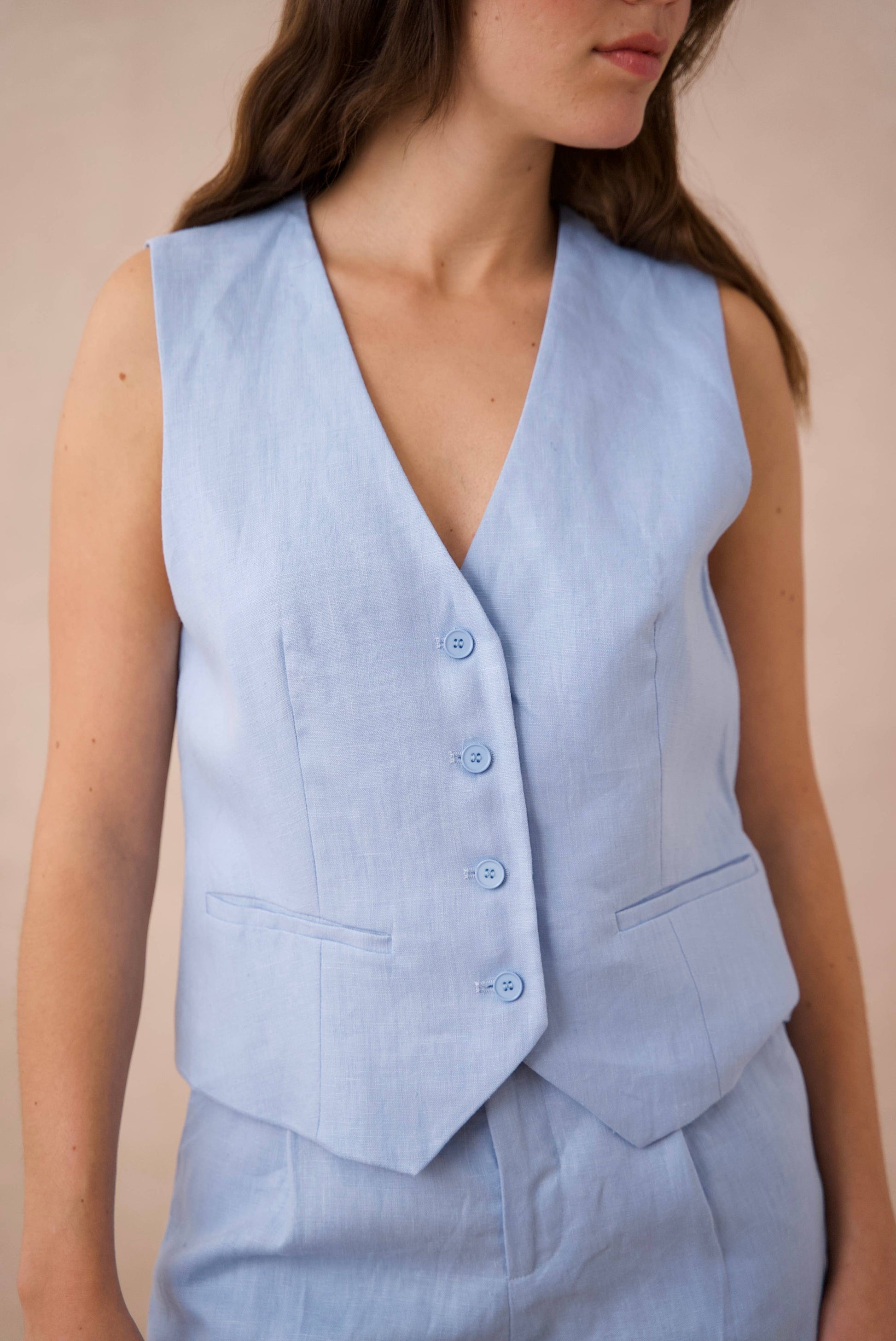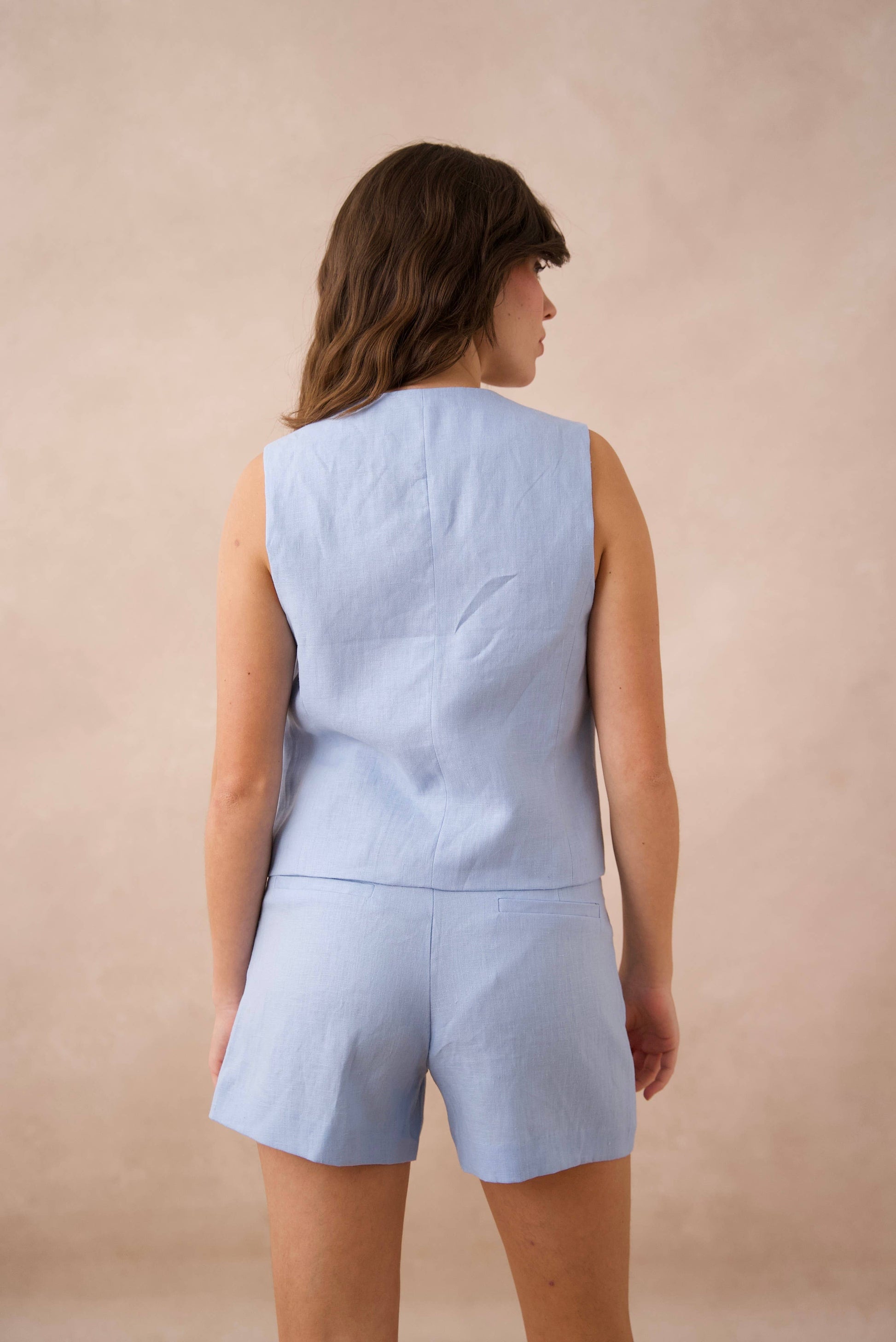 Die Weste Noa aus hochwertigem Leinen überzeugt durch ihre klare Silhouette und ihre vielseitige Kombinierbarkeit.