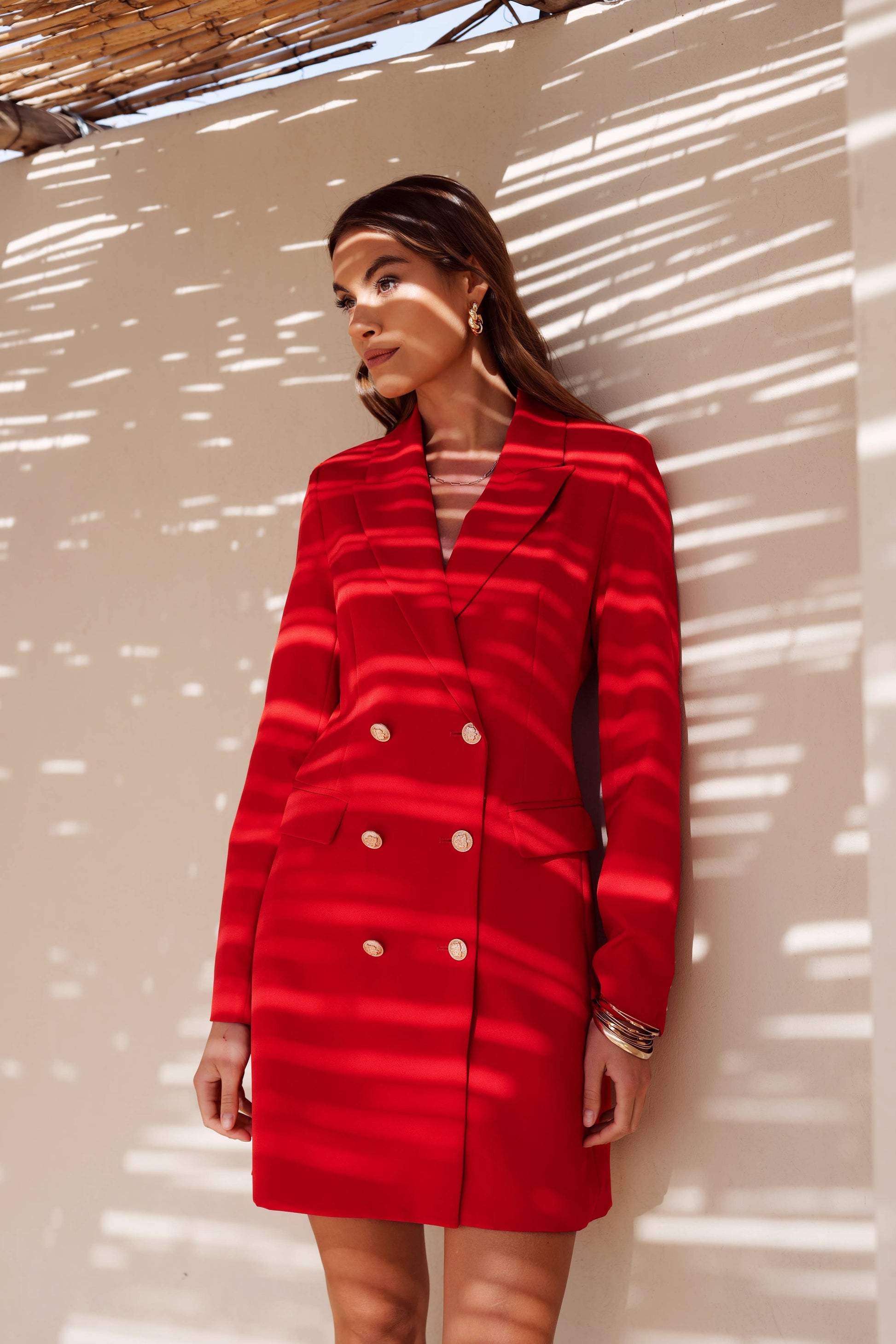 • Einfarbiges, tailliertes Design mit doppelreihiger goldener Knopfleiste