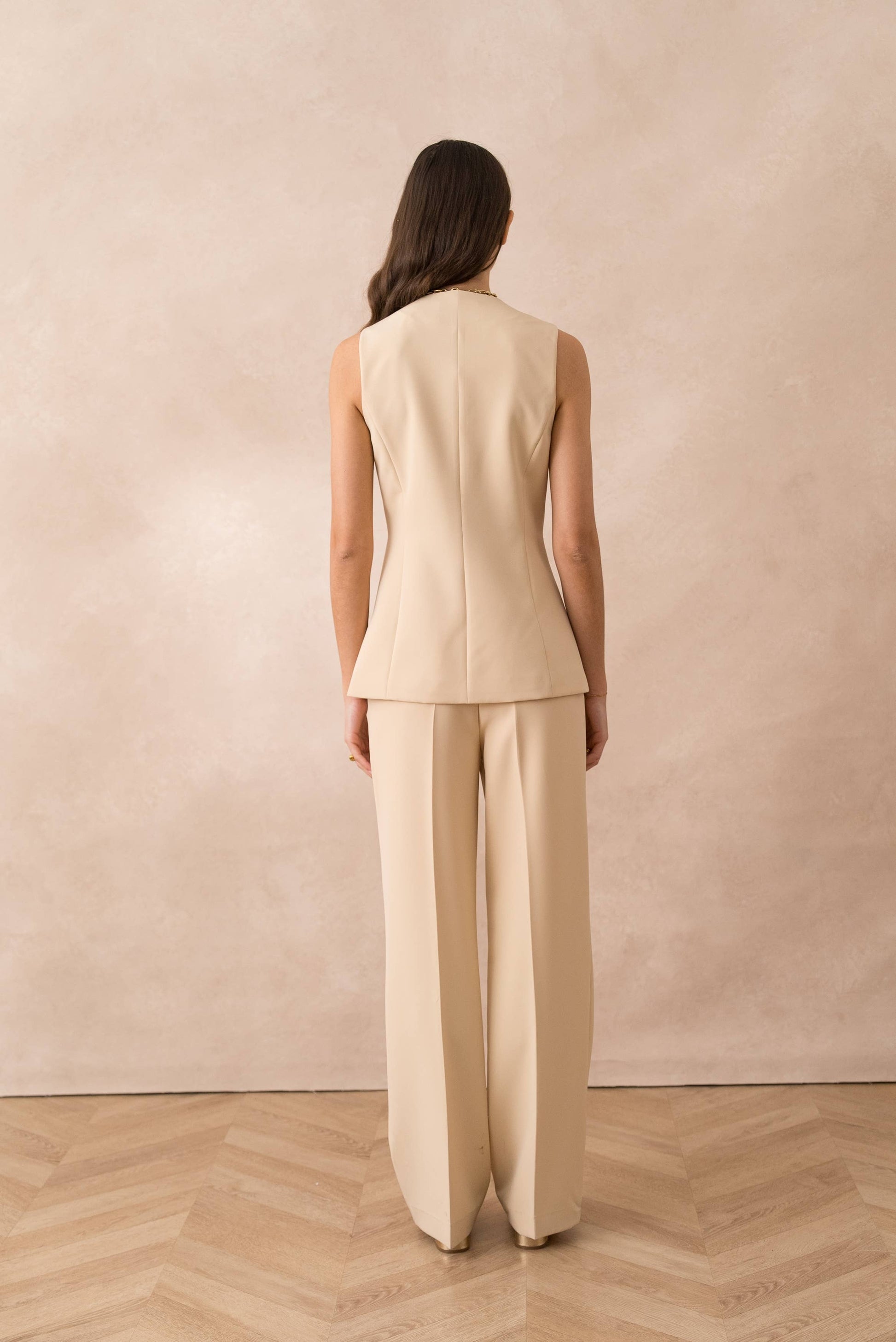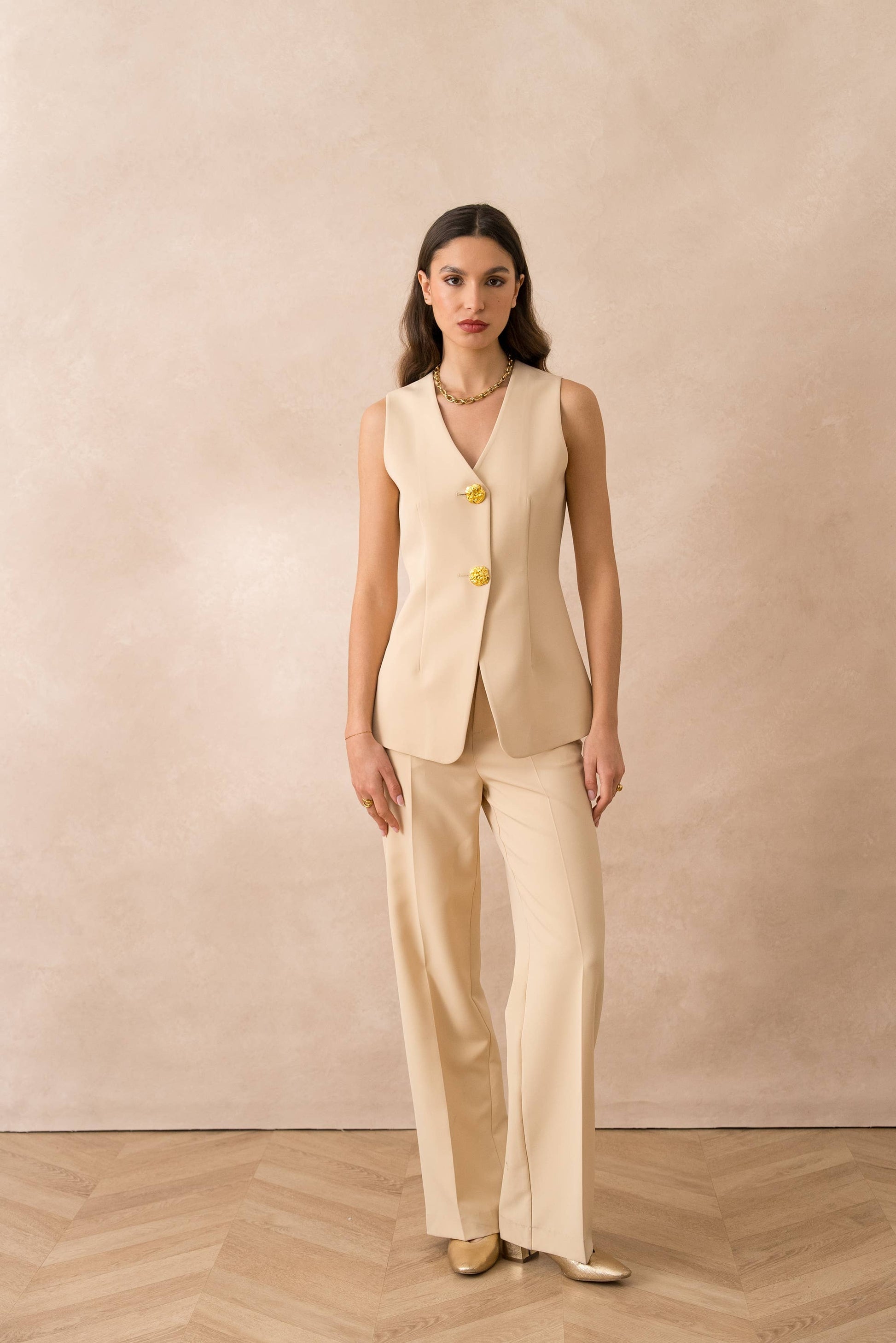 Die ärmellose Weste Auréa überzeugt durch ihren eleganten Fall und die edlen, strukturierten Goldknöpfe.